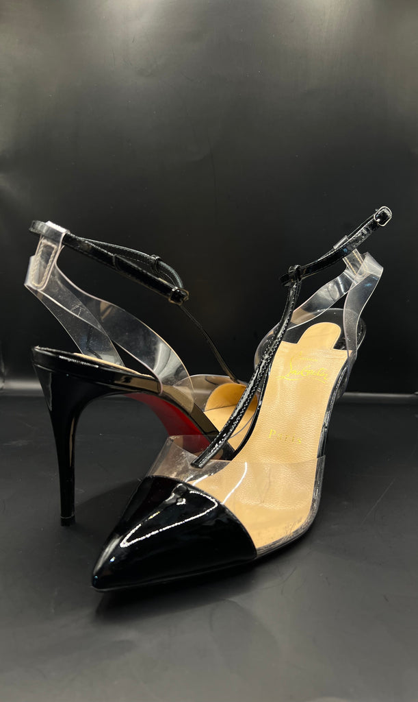 Escarpins C.Louboutin en plexi et vernis noir, avec sa boîte.