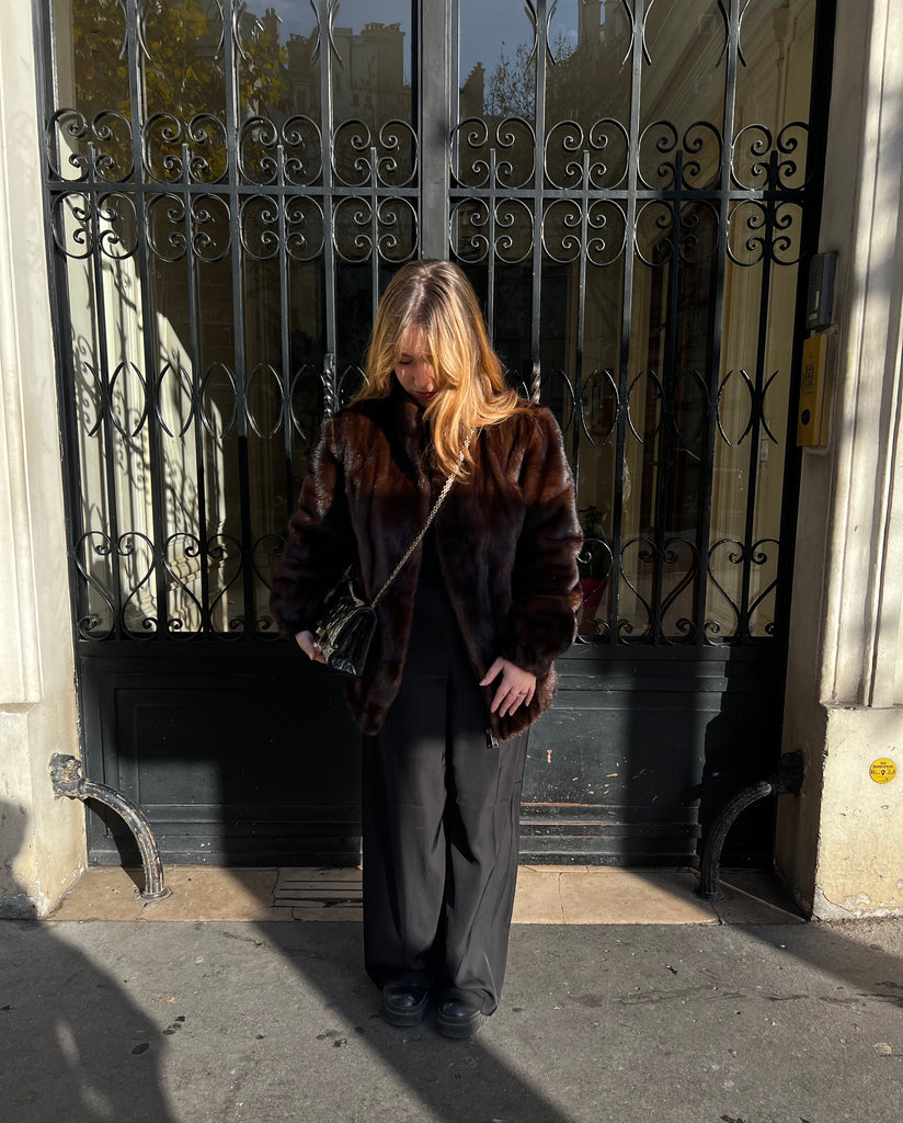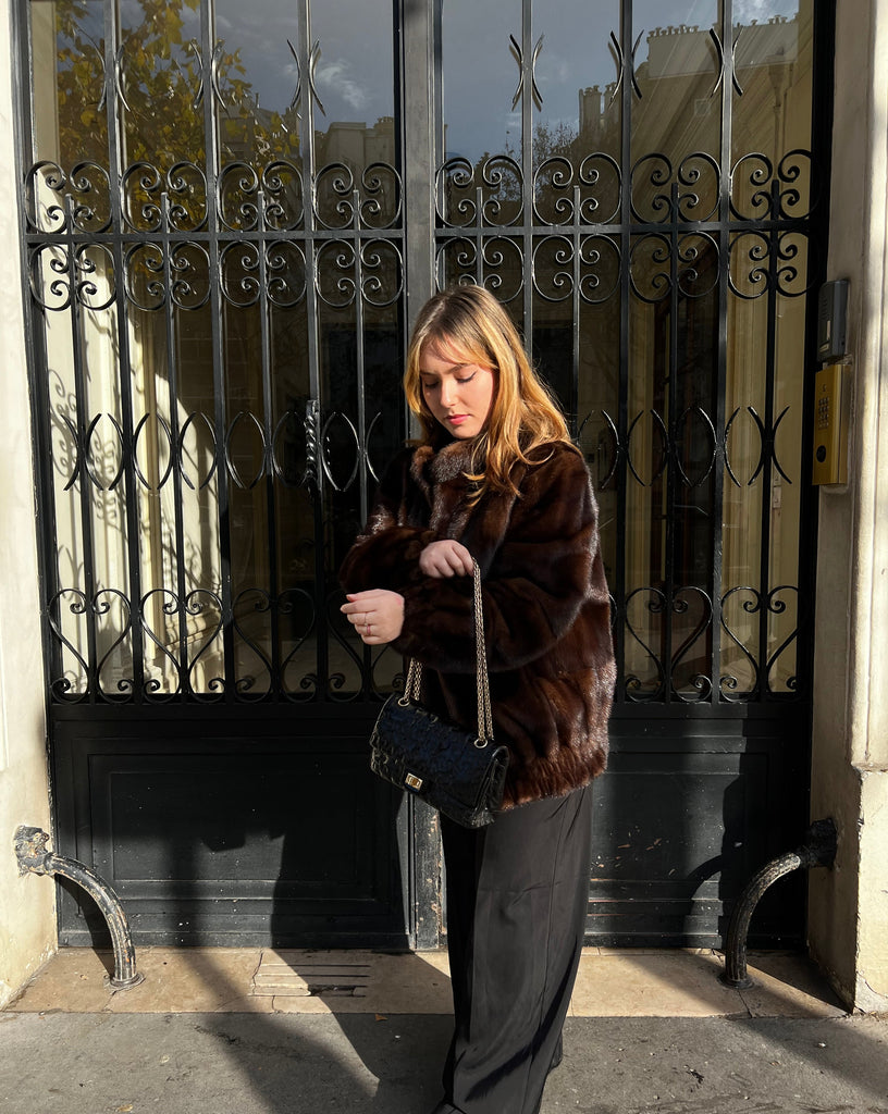 Blouson court en vison avec fermeture éclaire, marron. Porté avec un Sac Chanel puzzle.