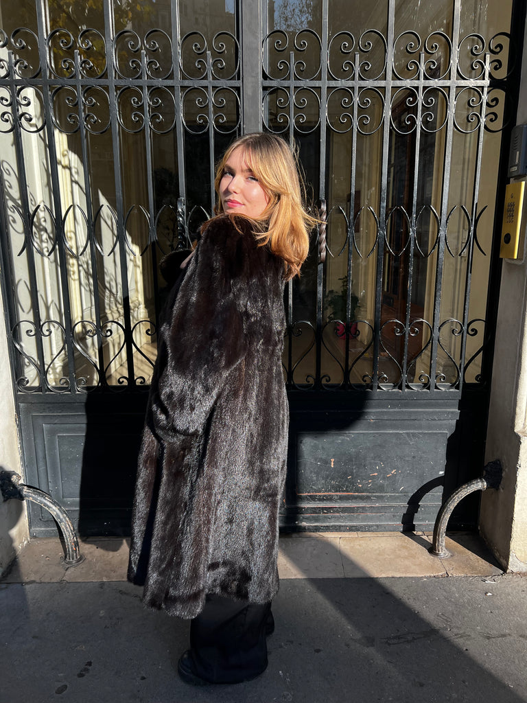 Manteau long en vison, porté avec un Sac Chanel nubuck beige.